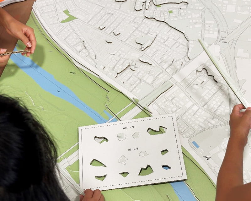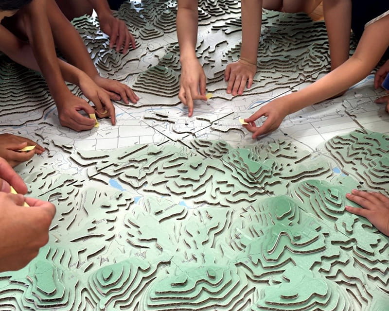 上島 学校や地域のイベントなどで、段ボール製のジオラマキットを使用して防災を学ぶワークショップをしています。防災教育の一環で、仙台市内の小学校でも段ボールジオラマ授業を展開しています。段ボールには、参加者の住んでいるエリアの地図が印刷されていて、等高線(地形図上で、同じ高さを結んだ線)に沿って切り抜かれています。それを自分たちで組み立てることで、高低差を体感で覚え、かつ自分でつくったものには興味が湧くので、自発的に色々な関心を持ってもらえるようにしています。