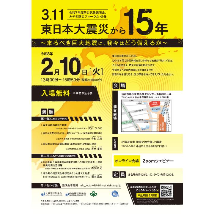 札幌管区気象台・仙台管区気象台・宮城県は、令和8年2月10日に「令和7年度防災気象講演会・みやぎ防災フォーラム」を開催します。