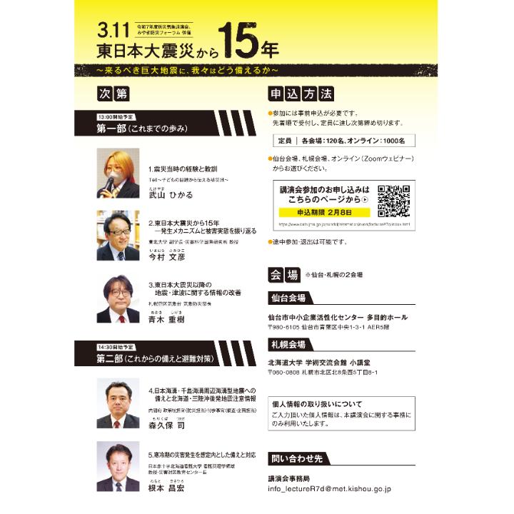東日本大震災を振り返り、北海道・三陸沖後発地震注意情報への理解を深め、日本海溝・千島海溝沿いの巨大地震への備えを考える機会となるよう、ぜひご参加ください。