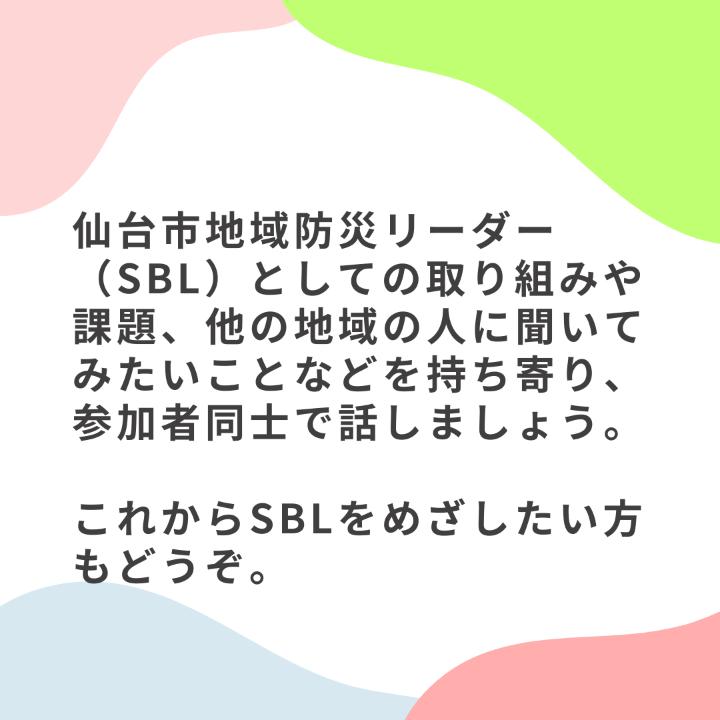仙台市地域防災リーダー(SBL)としての取り組みや課題、他の地域の人に聞いてみたいことなどを持ち寄り、参加者同士で話しましょう。