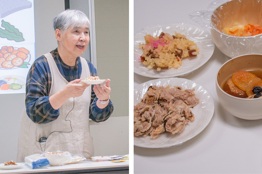 わしん倶楽部では、防災をもっと身近に、そして「楽しく」学んでもらうことで、自分の身は自分で守ることを伝えています。防災を「楽しく」と表現することに驚かれることもありますが、ここでいう「楽しく」は前向きに考え、主体的に行動することを意味しています。防災という言葉は、「難しそう」「堅苦しい」と感じる人が多い中で、ゲームやワークショップを通して、自然に関心を持てるようなきっかけづくりに取り組んでいます。例えば、災害時のあらゆる場面で正解・不正解のない質問を考える「クロスロード」、AEDや胸骨圧迫を学べる「PUSH」、災害啓発体操の「歩一歩(ほいっぽ)たいそう」、そして、乾物を使った防災食を通して、防災や日々の備えについて啓発を行っています。今回は、仙台市消費生活センターからの講師派遣の依頼を受けて、2025年10月31日に第3回仙台市消費生活講座「乾物でおいしく備える!家庭でできる防災食の知恵」というテーマで講演を行いました。