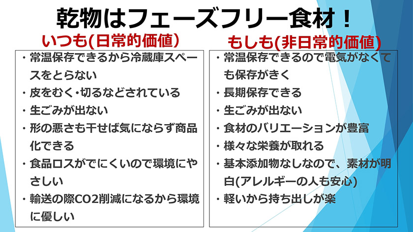 数ある防災食や備蓄方法がある中で、「乾物」に着目された理由はどのようなものでしょうか?