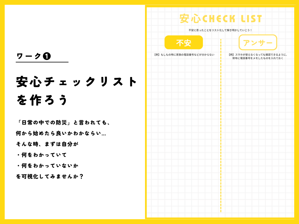 その中で、自分が考える行動でどうしてよいかわからないことや備えの不足に気づいたりすることができます。また、参加者からは自然と、東日本大震災で経験した話が出てきて、当時、持っていて助かったものや、反対にあるとよかったものを、幅広い世代で情報共有することができました。ワークショップ前後には「安心CHECK LIST」で地震発生時の不安なことを書き出してもらい、ワークショップを通した変化を感じてもらいました。
