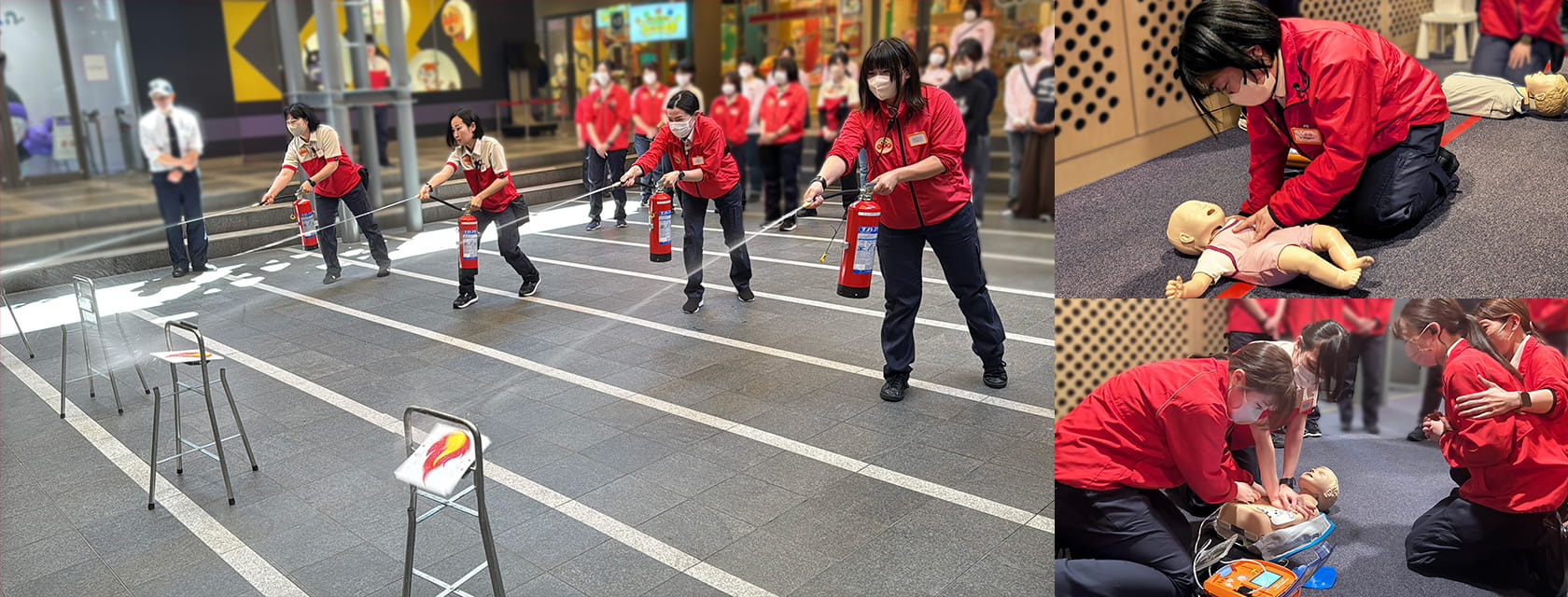 例えば大きな地震発生に備えて、施設全体で訓練を実施し、避難時のお客様への声掛けを実践し、避難経路の確認などを行いました。