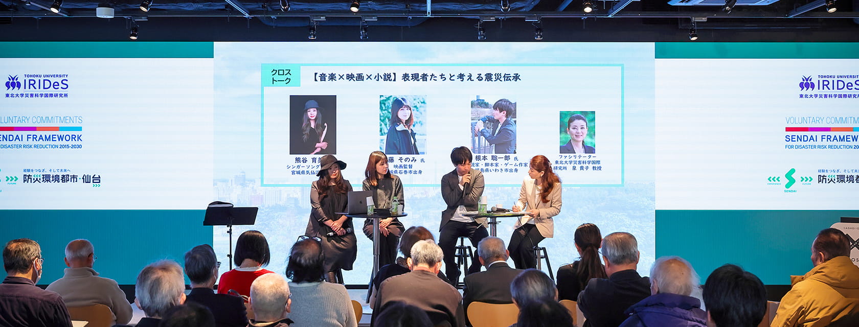 音楽・映画・小説という異なるジャンルで創作に取り組む担い手たちが、震災の記憶とどのように向き合い、どのように表現へと昇華してきたのか。そして、表現活動が震災伝承や未来の防災にどのような可能性を持ち得るのか。東北大学災害科学国際研究所の泉貴子教授がファシリテーターを務め、意見が交わされました。