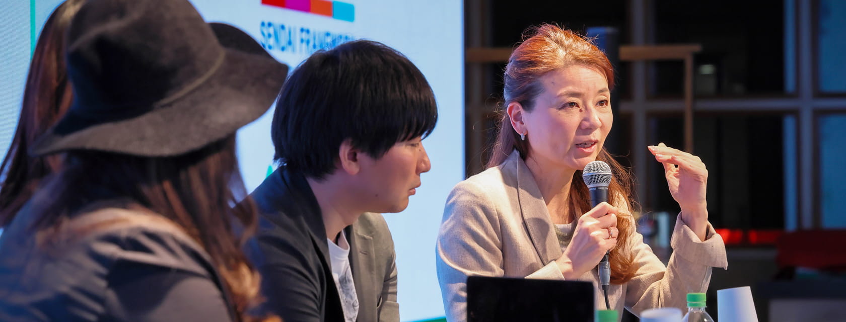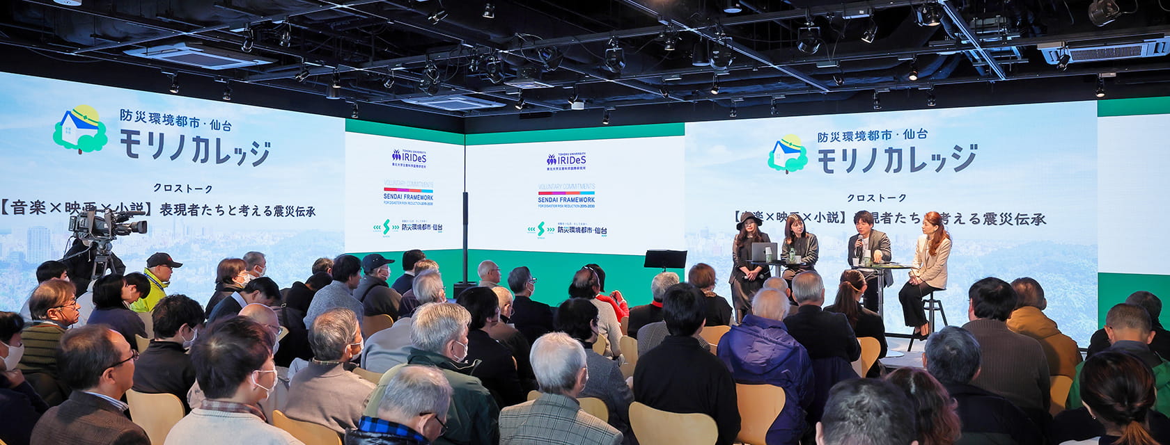 仙台市では、2015年の国連防災世界会議で採択された国際的な防災指針「仙台防災枠組2015–2030」について学ぶ「仙台防災枠組講座」を毎年開催しています。2025年12月6日に開催した講座のテーマは「仙台防災枠組と文化芸術との繋がり-災害文化を考える-」でした。その中で、モリノカレッジ連携企画として、シンガーソングライターの熊谷育美さん、映画監督の佐藤そのみさん、小説家・脚本家の根本聡一郎さんをゲストに迎え、クロストークを実施しました。