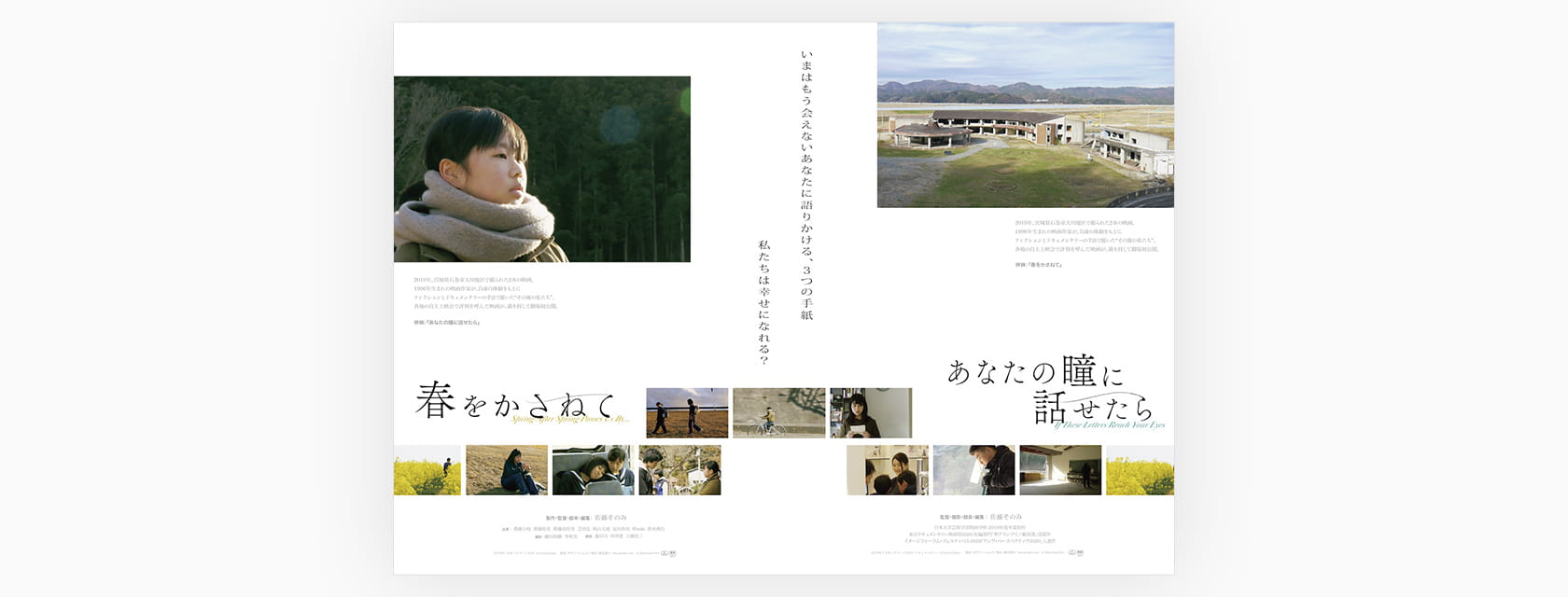 在学中に制作したフィクション『春をかさねて』とドキュメンタリー『あなたの瞳に話せたら』の2作品では、大川地区の震災や亡くなった方々について描きました。とても繊細な内容だったため、地域の人を傷つける可能性があるかもしれないとも思い、私の中で封印していましたが、映画の存在を知る方々から「見てみたい」という声をいただき、2021年頃から各地での自主上映会という形でその声に応えるようになっていきました。そのうちに私自身もこの映画を人に見てもらうことの価値を感じるようになり、2024年に自主配給で2作を劇場公開しました。東京の映画館を皮切りに、公開館数は全国28カ所まで広がりました。また、昨年は文化庁委託事業の「ndjc:若手映画作家育成プロジェクト」に参加し、そこで製作した短編『スリーピング・スワン』では、震災とは直接関係のない内容ですが、過去の痛みに向き合う若者たちの姿を描いています。