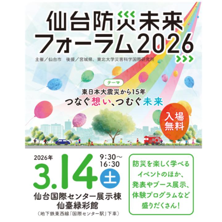 「仙台防災未来フォーラム」は、東日本大震災の経験や教訓を未来の防災につなぐため、発表やブース展示、体験型プログラムなどを通じてみなさまが防災を学び、日頃の活動を発信できるイベントです。日頃から防災に携わる方はもちろん、これから取り組む方等幅広い層の方々の参加・発信の機会になることを目指し、開催しています。